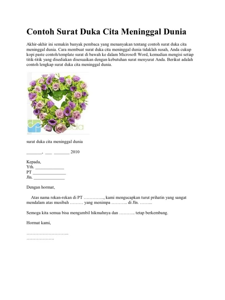 Saat berduka, banyak orang yang akan memberikan ucapan kepada keluarga serta kerabat yang ditinggalkan. Innalillahi wa inna ilaihi roji'un. Belas kasih, dan empati kepada keluarga yang berduka.3,4. Berikut adalah contoh sederhana surat tentang berita kematian sebai. Namun pengumuman berita kematian di masjid lewat pengeras suara tidak layak dilakukan.